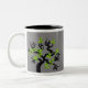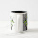 Love Birds On Sakura Tree And Chinese Love Symbol Mugs. A lovely mug with an Asian flair featuring two love birds on a blooming sakura tree with lime flowers under a grey, curled page and the Chinese love symbol on the right and another sakura tree on the left. Personalize it with your text.