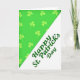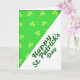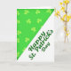 The front design shows a sharp diagonal line dividing the card into two lively sections that feel like a shared moment between friends. The upper-left area is filled with bright lime green, covered in a repeating pattern of slightly lighter shamrocks that drift across the space like a little wink of luck ☘️. Those three-leaf clovers add texture and movement, as if they’re floating toward someone you want to celebrate with. The lower-right area is a crisp white field that gives the design room to breathe, balancing the busy pattern above. Along the diagonal, the phrase “Happy St. Patrick’s Day” is set on the white section in flowing, connected lettering, angled to match the divide. The text is a deep emerald green, standing out clearly against the white while echoing the greens above 💚. The diagonal layout pulls your eye from the shamrock pattern down to the message, with green meeting white in a neat, slanted seam.