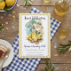 Invitation card for a birthday celebration, featuring a picturesque coastal Italian scene reminiscent of the Amalfi Coast. In the foreground, there is a bottle and a glass of limoncello surrounded by fresh lemons and green leaves on a rustic wooden board. The background depicts charming colorful Mediterranean houses overlooking the sea. The card has a cheerful yellow gingham border and elegant blue script. The text reads "Sweet Celebration, your own text and provides details for the date, location, and RSVP information.