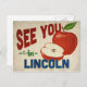A charming Lincoln Nebraska vintage travel postcard featuring a lovely red apple, along with fun retro style text that says, "See you in Lincoln"