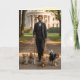 A cute dog greeting card featuring Abraham Lincoln walking small dogs at the White House.