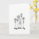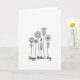 Designed with a minimalist black-and-white look, this card features a cluster of line-drawn flowers rising from the lower edge on a bright white background. Slender stems and simple leaves lean toward one another as if sharing a quiet moment, giving the bouquet a gentle, friendly closeness ❤️. Round, many-petaled blooms mix with a closed bud and a tall, lily-like flower, creating an easy rhythm of different heights across the center. The thin black outlines keep every petal and curve clear without adding extra shading, so the arrangement feels light and airy. Below the bouquet, a flowing line of text sits centered near the bottom in black, standing out clearly against the white space. The lettering is slightly larger than the fine floral lines, making the message easy to spot at a glance. A few open blossoms appear near the top of the cluster, while smaller leaves fill the gaps, like a soft garden sketch 🌼. The tallest flower reaches upward just right of center, with a curved bud beside it and two round blooms spaced to the left.