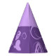 This paper party hat features a fun design based on circular lines, artistic spots and flat polka dots in lilac on a purple background. The upper part is the same color as the print.