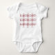 This baby bodysuit has a mid-century modern design of cranberry vertical lines with hexagons strung horizontally on a field of white.