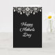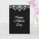 This card features a tall, vertical layout with a deep black background that makes the pale artwork stand out. Centered on the front, the words “Happy Mother’s Day” appear in flowing white lettering, with gentle curves that feel like a soft embrace ❤️. Along the top edge, a thin horizontal border of leafy stems and small blossoms stretches from side to side in creamy white. The foliage details suggest a caring bond, like two friends leaning close in a quiet garden moment 🌼. Hanging from the border are several teardrop-shaped ornaments that drop down slightly, adding a delicate, jewelry-like touch. The high contrast between black and white keeps every line crisp, from the text strokes to the tiny petal shapes. The upper border shows vine-like leaves with small flowers and a row of white teardrop pendants dangling against the black space.
