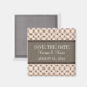 Trendy and chic Fancy Lattice Save the Date Magnet featuring a stylish circle and diamond studded pattern over a vibrant peach background with a broad two-toned brown border. This elegant save the date magnet is perfect for announcing your modern wedding. Easy to customize, simply add your wedding details in the text fields provided. Click "Customize It" to find more personalization options.