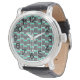 This men's watch has a mid-century modern design made of five black lines and two turquoise rectangles repeated across the design.