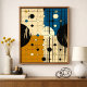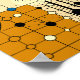 The artwork features a precise geometric composition combining warm orange and cool blue sections, separated by a background of light yellowish beige. Thin black lines form an interconnected grid of squares and rectangles, intersected by circles of various sizes in black, white, and blue. Some circles include subtle striped patterns, adding texture and rhythm. The surface shows distressed black marks, giving the design a vintage or worn aesthetic. The overall impression is a balance between order and randomness, structure and abstraction.