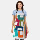 This apron has a mid-century modern design of lines and rectangles in retro shades of orange, gold, cranberry, teal, green, blue, turquoise, and green.