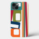 This phone case has a mid-century modern design of lines and rectangles in retro shades of orange, gold, cranberry, teal, green, blue, turquoise, and green.