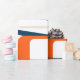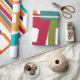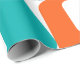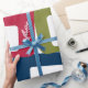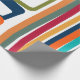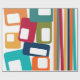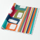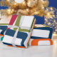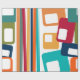 This wrapping paper has a mid-century modern design of lines and rectangles in retro shades of orange, gold, cranberry, teal, green, blue, turquoise, and green.