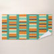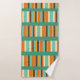 This towel set has an off-white washcloth, a seafoam hand towel, and a bath towel with a mid-century modern design of horizontal lines made from vertical stripes in seafoam, off-white, two oranges, and brown.