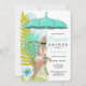 Lingerie bridal shower invitation features robins egg blue and teal tropical flowers, umbrella and blonde bride to be. Available with blonde, brown, and red hair and light and dark skin.