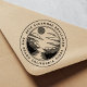 Mark your envelopes with artistic flair using this custom self-inking rubber stamp, featuring a striking linocut-style landscape scene that encircles your return address. The bold lines depicting mountains, sun, and clouds create a clear, consistent impression, adding a modern and artistic touch to all your mail. Ideal for efficiently personalizing envelopes, invitations, and packages for personal or small business use. This durable, pre-inked stamp provides thousands of crisp marks, saving you time while expressing your unique aesthetic. A practical and highly distinctive tool for creative individuals, outdoor enthusiasts, or a thoughtful gift for any home.