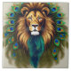 A face on lion's head surrounded in peacock feathers as an extension of it's mane.