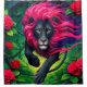 This shower curtain has an artsy lion on it.