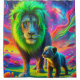 This shower curtain has a cool lion design on it.