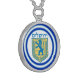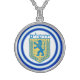 Medium round sterling silver necklace with an image of a blue and yellow Lion of Judah emblem on white with light blue and dark blue borders and “Jerusalem” in Hebrew in blue letters above it. See matching square button, square charm, large round premium metal keychain, square double-sided acrylic keychain and wrist watch. See the entire Hanukkah Necklace collection under the ACCESSORIES category in the HOLIDAYS section.