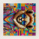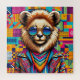 The image is a digital illustration of a lion dressed in a stylish manner, standing in the center against a vibrant and colorful geometric background. The animal has round sunglasses with blue lenses and a jacket that boasts colorful geometric patterns. The animal's pose and accessories suggest a cool and confident demeanor. The backdrop is a kaleidoscope of colors, including yellow, red, blue, orange, brown, and green, composed of various irregular geometric shapes that contribute to creating a lively and dynamic atmosphere.