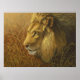 Golden Son is a painting of a male lion walking through tall golden grass.