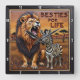 This dramatic square wall clock features a highly dimensional illustration of a brown lion with an expressive face and a striped zebra standing closely together. The entire design is rendered in muted brown, tan, and dark leather-like tones, strongly suggesting a deep sculpted relief or Sculpted Leather Look. The lion has a textured mane and is positioned on the left, while the zebra is on the right, appearing happy with prominent stripes. They are framed by a simple border of stylized leaves and vines carved into the perimeter. The background is a dark, heavily textured leather panel with carved foliage elements. The large, three-dimensional embossed text "BESTIES FOR LIFE" is carved across the top center in a bold, golden serif font. The clock face features a simple clock face border with large, white, numbered tick marks (1 to 12) integrated into the outer frame. The artwork is surrounded by a thick, dark brown decorative border that resembles a black wood frame.