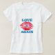 A bright graphic featuring a pair of bold, red lipstick-marked lips in the center. Surrounding the lips are the words LOVE at the top and AGAIN at the bottom, both in large, vibrant blue letters. The word ME is placed in the middle of the lips in white, creating a striking contrast. The background is plain white, enhancing the overall visual impact.