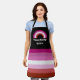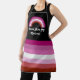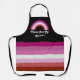 Women's apron with an image of a lipstick lesbian pride flag and a rainbow; pink, white, and orange design on a black background, with a customizable text template for your own name or message