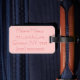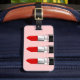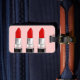 This luggage tag features three red lipsticks on the front, and customizable text on the back. The pink backgrounds can be customized as desired.
