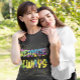 This shirt is just joyful -- inspired by Philippians 4:4 in the Bible "Rejoice in the Lord always. And again I say Rejoice!". Slightly psychedelic, definitely colorful and modern styling -- with yellow, purple, turquoise and green intermixed, yellow confetti effect. Proclaim your determination to rejoice in all things, because He is ultimately in control!