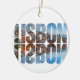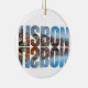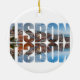 Lisbon text composed of panoramic old town view with text reflection in water in Lisbon, Portugal