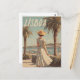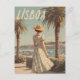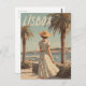 This charming vintage poster depicts a graceful woman in a classic 1950s dress standing at the harbor in Lisbon. Fishing boats gently float on the water behind her, while the sun casts a warm, golden glow over the historic buildings in the background. The soft retro color palette and nostalgic textures capture the elegance of mid-century coastal life in Portugal. Perfect for lovers of vintage fashion, seaside scenes, and timeless European travel art.