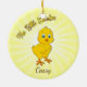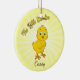 Cute baby chicken cartoon with blue eyes and sunny rays background.