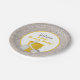 Adorable, gender neutral baby shower design for the beach lover Mommy to be! Design features a background of grains of sand. In the center is a white circle with yellow trim. At the bottom of the circle is a yellow pail and a white shovel. Next to the pail is a white sea shell. Above the sea shell and pail is text in dark grey and yellow font that says Welcome Little Beach Baby. This fun, all about the beach themed baby shower design is perfect for the Mommy to be that lives near the beach or just love the beach! This smaller sized plate is great for serving up baby shower cake and desserts.