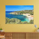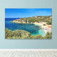 A beautiful canvas print featuring an original photograph of the amazing view of the ultra-transparent crystalline water of the Sardinian clear blue sea in all shades of turquoise, surrounded by green Mediterranean scrub and a little golden sand beach on a sunny summer day under a clear blue sky.