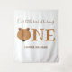 An our little bear is turning one first baby birthday tapestry. This tapestry is white and brown with the word "One" in large letters with a bear face illustration as the first letter of the word. Simply, customize it, add it to your cart, and happy birthday to your wonderful baby!