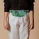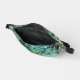 Stylish fanny pack for the on-the-go person and features a photo image of little, blue Brunnera flowers and leaves. Back of fanny pack is black.