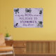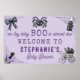 Little Boo Itsy Bitsy Spider Halloween Baby Shower Welcome Sign Poster - A little boo is almost due! Add a special touch to your baby shower decor with this personalized Halloween baby shower welcome banner poster sign. Perfect for a spooky fall or autumn October baby shower. Dark and light purple with black color palette. Super cute and adorable baby themed watercolor illustrations including a baby pacifier, a vintage baby stroller or pram with spiderwebs, a coquette black bow and adorable itsy bitsy spider. Personalize this baby shower welcome sign banner poster with your name. All text is editable.