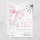 This cute and spooky baby shower invitation features a beautiful watercolor illustration of a pink bow and cute little ghosts, perfect for celebrating the upcoming arrival of a little one in the halloween season.