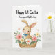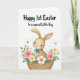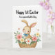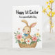 This card features a long-eared bunny with warm tan fur and gentle peach shading, looking outward with wide eyes and rosy cheeks that feel sweet and friendly 🐰. A neatly tied blue bow sits at its neck, adding a bright accent against the soft, fur-like texture. The bunny is nestled inside a sturdy woven basket, and the close, cozy framing makes it seem like the little creature is being lovingly tucked in. Around the basket, spring flowers and greenery curl inward as if offering a quiet, affectionate welcome, with coral pink, creamy yellow, and white petals mixed among fresh green leaves. Small star-shaped blossoms and thin twigs are scattered through the arrangement, adding extra detail without crowding the scene 🌷. Across the top on the white background, the message “Happy 1st Easter to a special Little Boy” appears in a flowing, hand-lettered style, set in a dark ink that stands out clearly above the illustration. The basket shows a crisscross weave pattern, with layered blooms clustered along the rim and around the bunny’s shoulders.