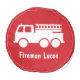 Give your little firefighter his very own custom pillow pouf! Pouf adds a cute modern touch to the bedroom or nursery of your little boy and features a fun fire truck and white stripes on a red background. Custom text says Fireman followed by your child's first name.