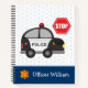Give your special little police officer his own custom notebook! Notebook features a large police car, a stop sign, a badge, and your young officer's first name. Behind the police items are soft blue polka dots and a dark blue border. Any young policeman is sure to love this bright and fun notebook!