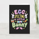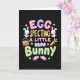 This card features a deep black background with the main phrase “EGG SPECTING A LITTLE BUNNY” centered in large, rounded letters that look slightly raised and glossy, colored in soft pastel pink, lavender, yellow, and mint green. Near the top of the wording, two small white rabbits sit on either side, their pink inner ears and closed-eye smiles giving them a gentle, affectionate look 🐰. The layout feels like a shared secret between close friends, with the rabbits appearing to “lean in” toward the message as if they’re in on the news together. Beneath the main line, a wicker-style basket holds several bright blue eggs, and a few more decorated eggs rest nearby with simple stripes and solid pastel fills. Off to one side, an orange carrot with leafy green tops adds a cozy spring touch, while a pair of tiny pink baby footprints sits low in the design, hinting at a tender new chapter 🐇. Small yellow flowers are scattered across the dark space like little sparks, balancing the composition without crowding the text. The phrase stays centered and dominant, with the rabbits above and the basket, eggs, carrot, and footprints arranged below in a neat, sticker-like cluster with glossy highlights.