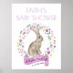 Little Bunny Baby Shower sign which you can personalize with the name of the mom to be. The design features an adorable bunny rabbit with a pretty wreath of folk art doodle flowers and a lilac banner, lettered with a little bunny is on the way. If you would like the design for matching products, please message me.