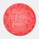 A magnet featuring the quote from William Shakespeare’s A Midsummer Night’s Dream “Though she be but little, she is fierce” surrounded by flowers and leaves against a red gradient background.