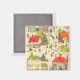 Retro design with red and lime green. Christmas village with decorated Christmas trees, decorated houses, people walking about and cars in driveways. Cute