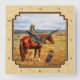A young cowgirl waits for her dad to catch up so they can begin rounding up the cattle. All on a pale yellow patterned background.