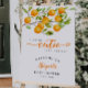 Cute little cutie theme gender neutral baby shower welcome sign featuring watercolor illustration of oranges on a fruit tree. The text says "a little cutie is on the way." Perfect for a summer celebration.