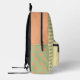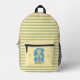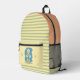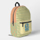 A cute multicolor school backpack for kids featuring a yellow duckling holding a book , some green and yellow stripes on the front and some duck orange paw prints on the side . Personalize it with the child's first name and last name initials .