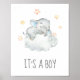 This little elephant baby shower it's a boy sign is perfect for a modern baby shower. The modern design features a modern and cute watercolor safari zoo animal sleeping on a soft cloud with twinkling yellow stars.