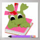 Cute little green frog laying on her stomach over a school book. She;s wearing pink and a purple pencil is in front of her